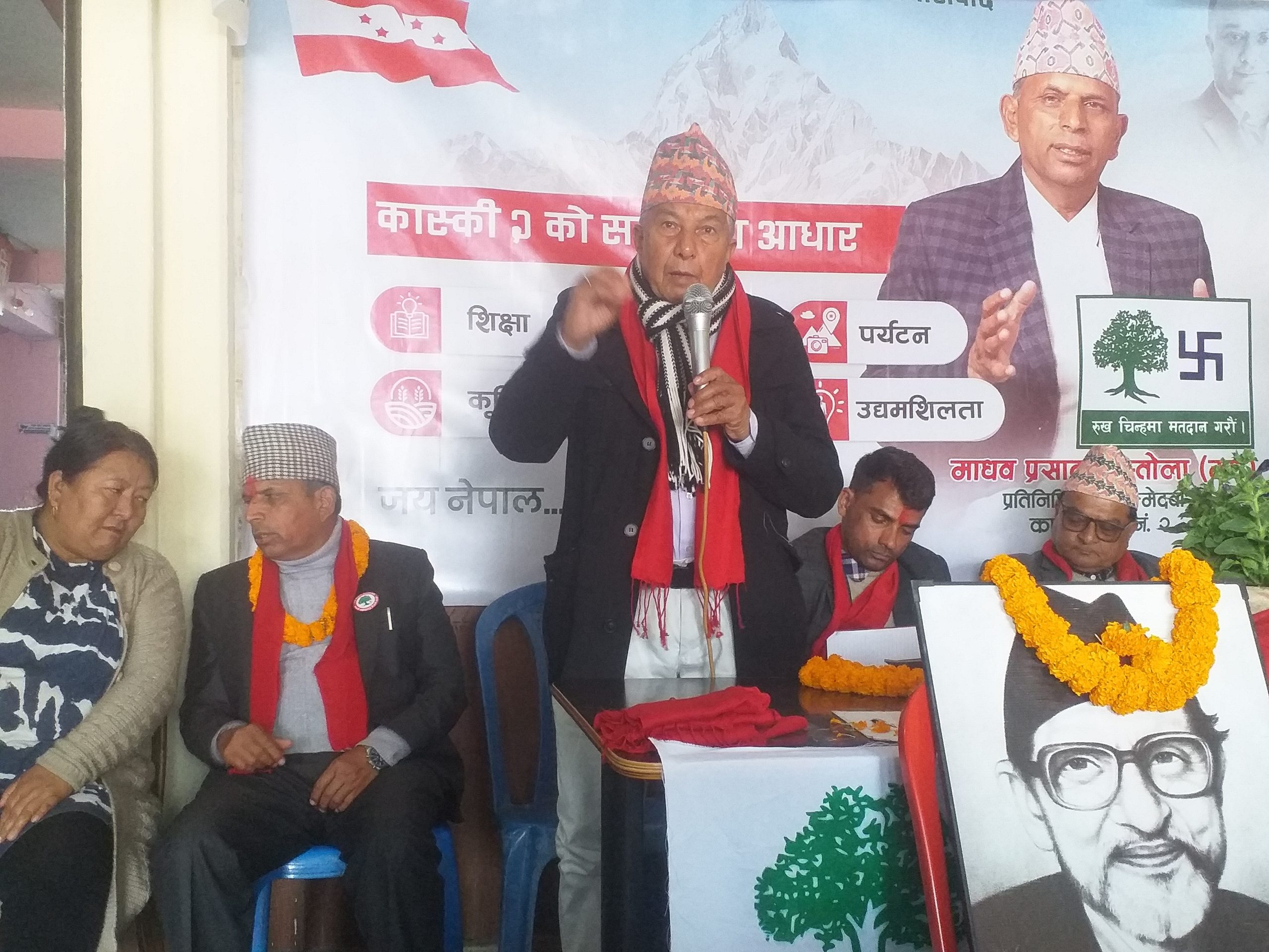 कास्की २ का काँग्रेस उम्मेदवार माधव बास्तोला भोट माग्दै आँटीघर मौजामा